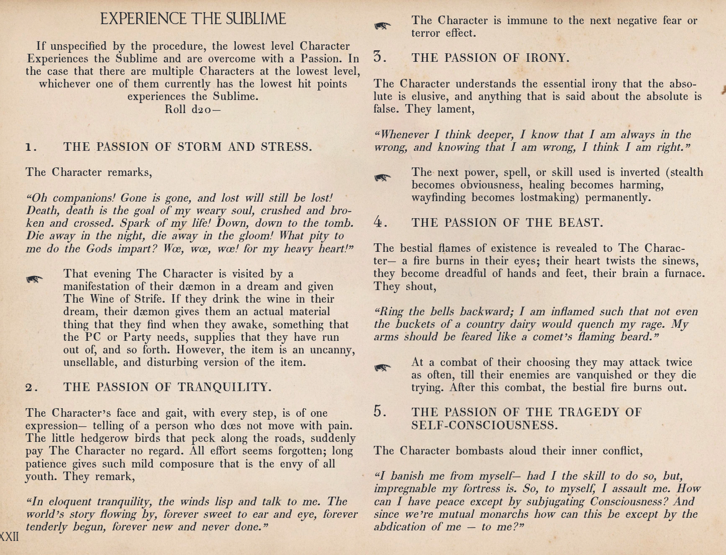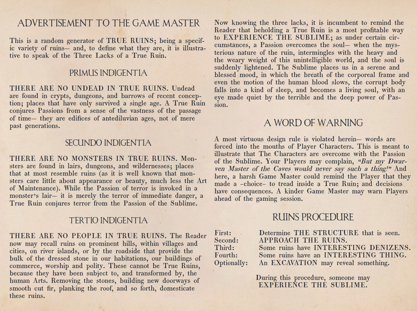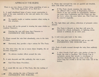 The True Ruins Procedure creates a “Deck of Many Things” type experience by generating RANDOM ruins, with RANDOM denizens and RANDOM treasure, that will sometimes cause Characters to Experience the Sublime and be overcome with RANDOM Passions– causing the Characters’ mouths to spew interpolated poetry of Romantic Era writers (William Wordsworth, Emily Dickenson, Percy Shelley, Lord Byron, and so forth) before receiving RANDOM benefits or curses.